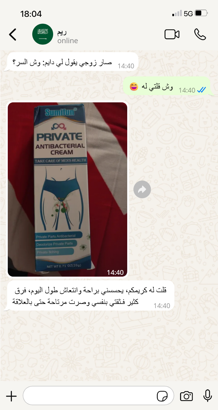 كنت أكره الصيف بسبب الحكة والحرارة في المنطقة الحساسة، وما كنت أقدر ألبس راحتي. بس بعد استخدام الكريم، أحس بثقة ونظافة طوال اليوم، وكل شعور الإزعاج اختفى.