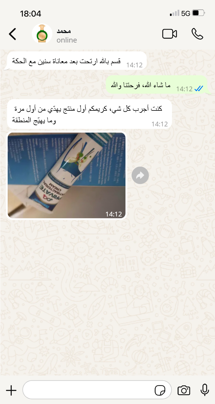 كنت أعاني من التهابات مزمنة تسبب لي إحراج، حتى في صلاتي ما كنت مرتاح. من بعد استخدام الكريم بأيام، حسّيت براحة حقيقية وفرق كبير، صرت أقدر أتحرك بثقة وأصلي وقلبي مرتاح.